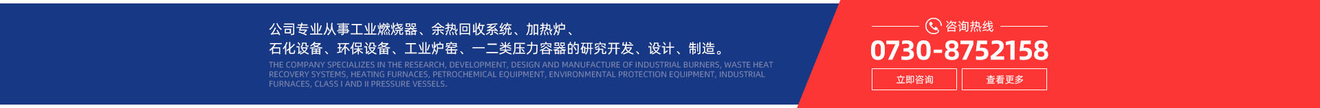 公司專業(yè)從事工業(yè)燃燒器及其智能化控制系統(tǒng)、余熱回收系統(tǒng)、加熱爐及各類爐配件、石化設(shè)備及配件、環(huán)保設(shè)備、工業(yè)爐窯及其輔助設(shè)備配件、一二類壓力容器的研究開發(fā)、設(shè)計、制造。